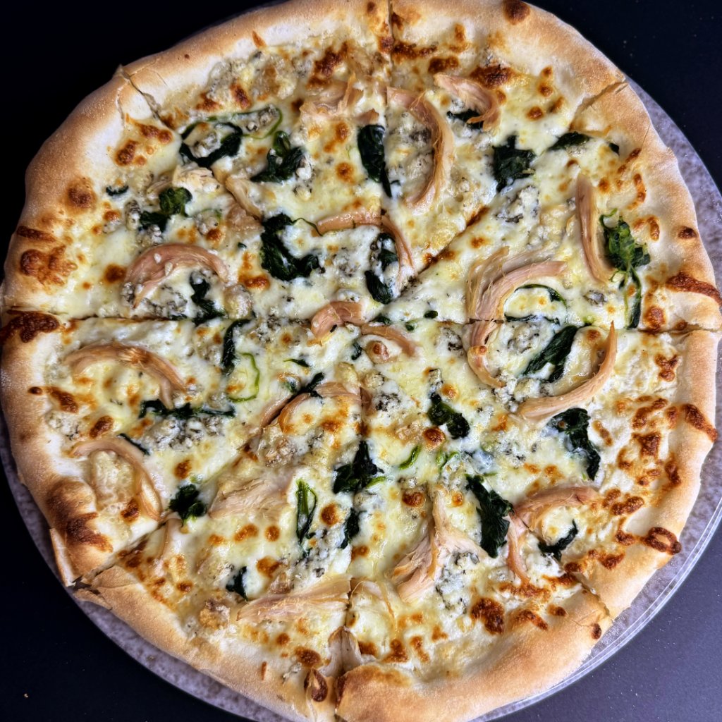 bílé sugo, mozzarella, špenát, kuřecí maso, niva